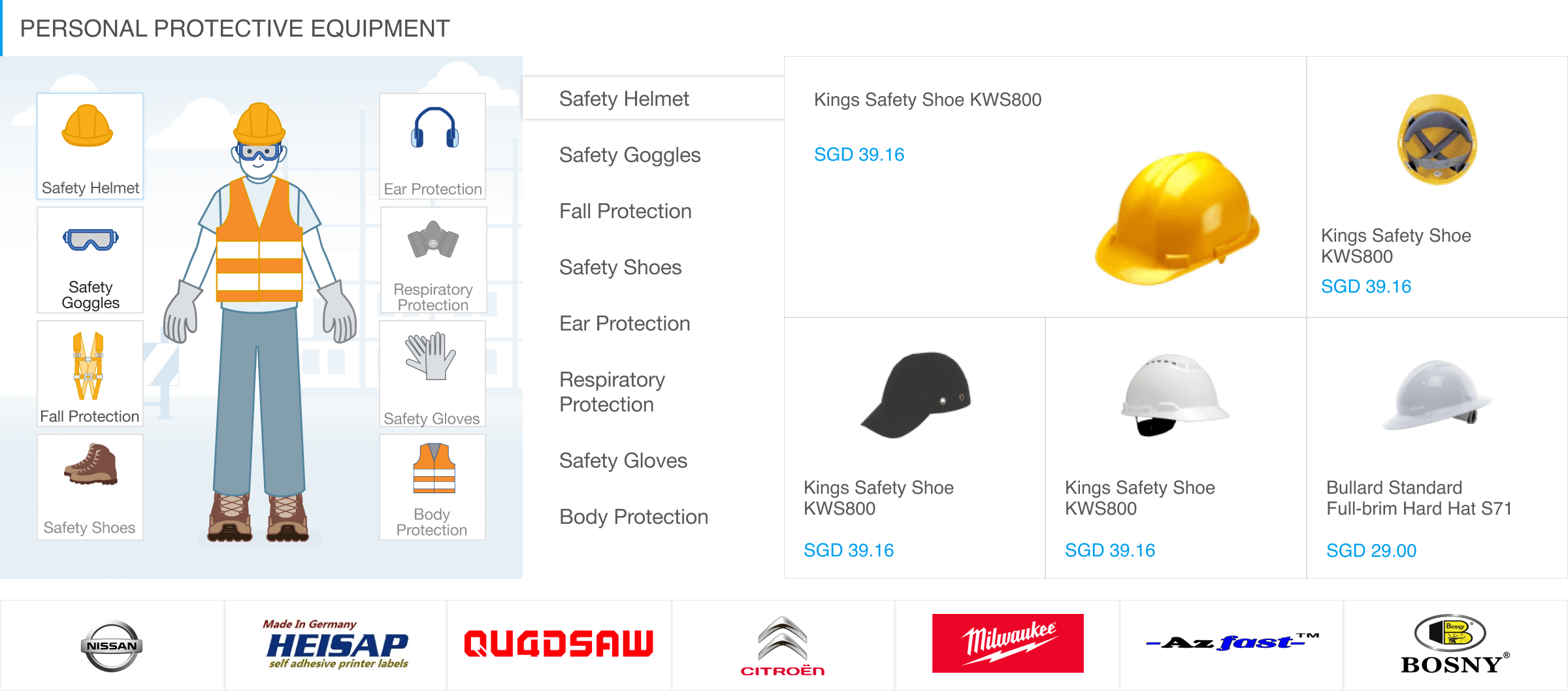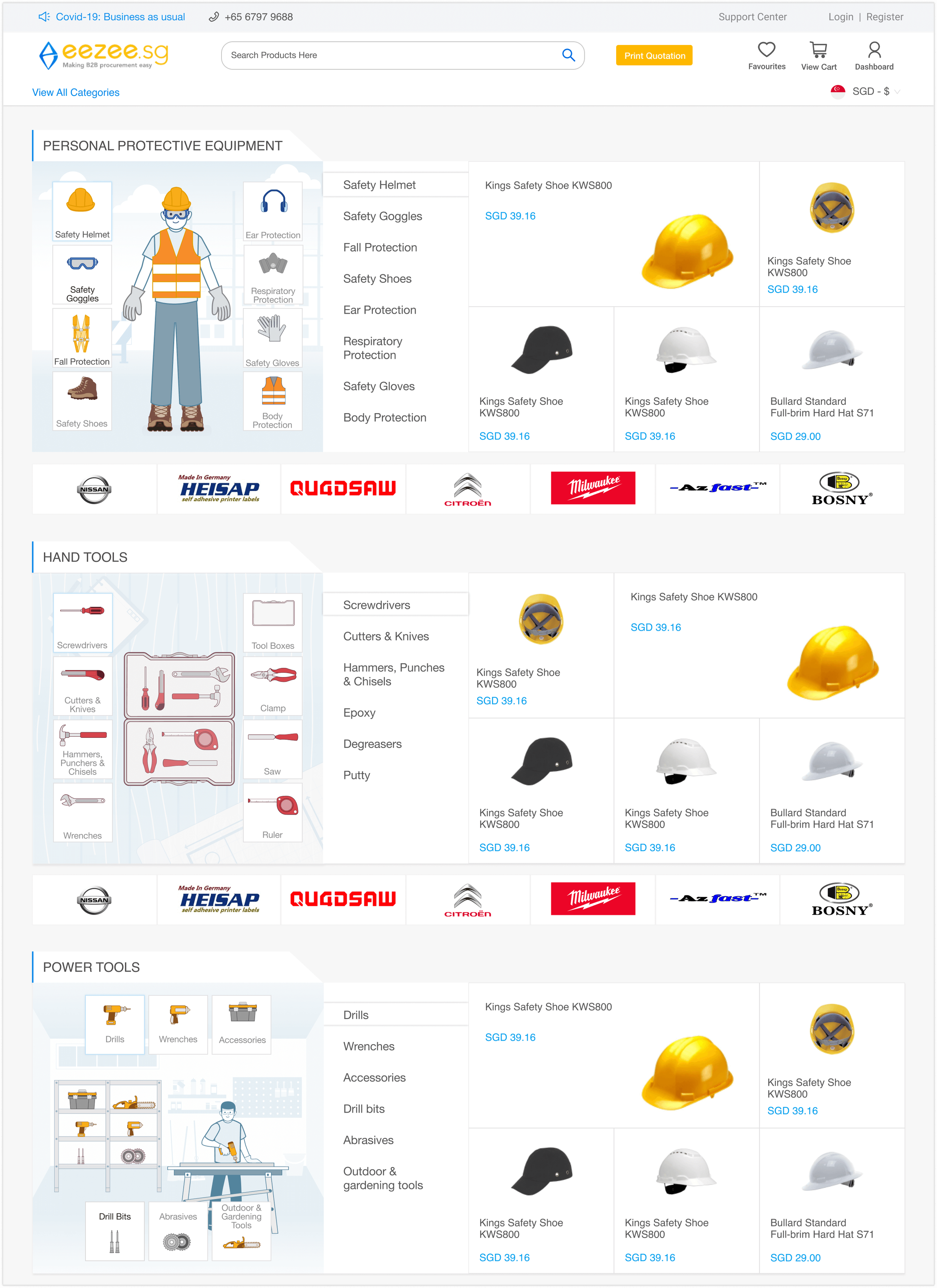 The product environment on Eezee's homepage was designed as a tool to enhance users' experiences while browsing through Eezee's extensive catalogues and categories. In collaboration with the tech team, we developed a CSS styling tool to seamlessly integrate illustration assets with Eezee’s responsive interface. By the time of its launch, we had illustrated 8 categories, each with over 5 sub-categories: Personal Protection Equipment, Hand Tools, Power Tools, Metalworking, Adhesives, Lubricants, Instrumentation, and Office Supplies.